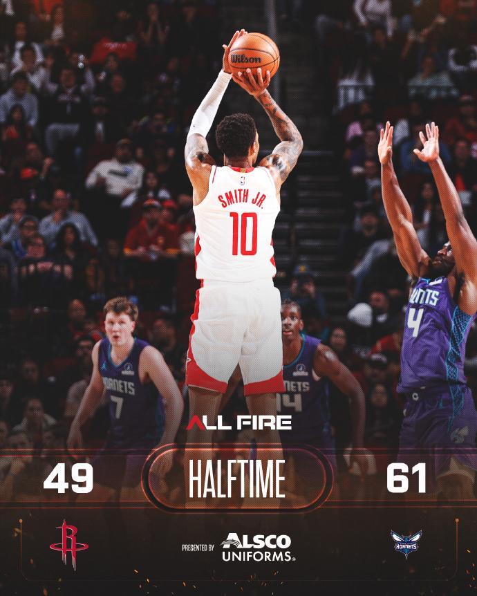 次节比赛,黄蜂进攻火力升级首次单节得分30+,火箭下滑到首次单节不足25分。第二节前3分钟双方维持34-34,黄蜂多点开花一波15-2攻势拉开比分,火箭继续以39-53落后。火箭一波7-0攻势追分,黄蜂继续拉开领先优势,火箭单节23-32输掉9分,上半场结束火箭49-61落后黄蜂。前两节比赛,黄蜂三分21中9,三球4记三分16分与克努佩尔13分,引领4人得分上双;火箭三分14中7,杜兰特12中5命中3记三分16分与史密斯13+5,申京6中1仅得到3+5+3。