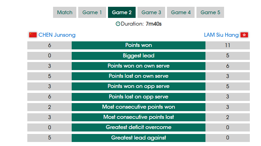 第一局开场陈俊菘拼的很凶,开场4-2领先,随后6-3继续领先,陈俊菘8-4拉开分差,林兆恒连续失误5-10,最终陈俊菘11-5拿下第一局的胜利。